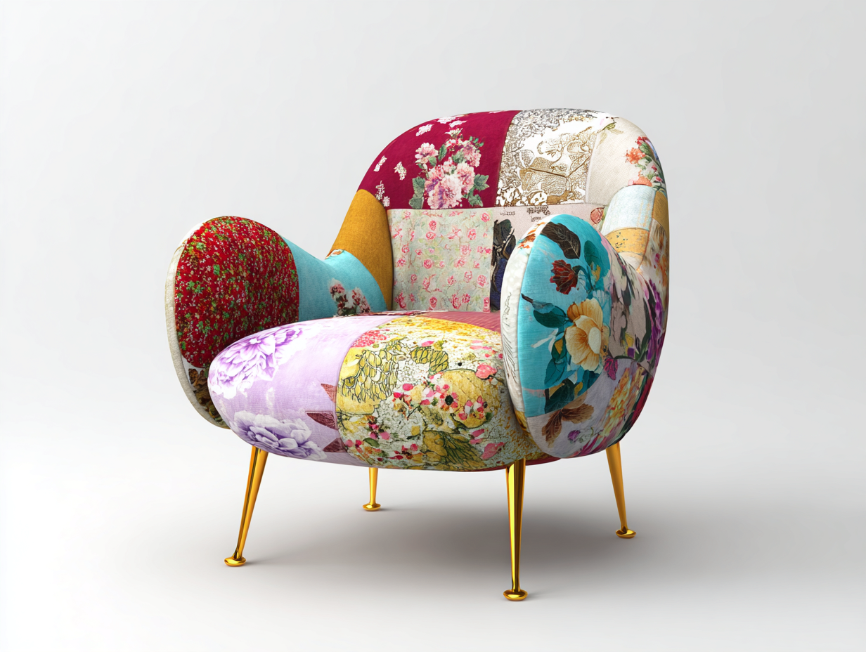 Ce fauteuil au design patchwork se distingue par son style décoratif et son confort d'assise.